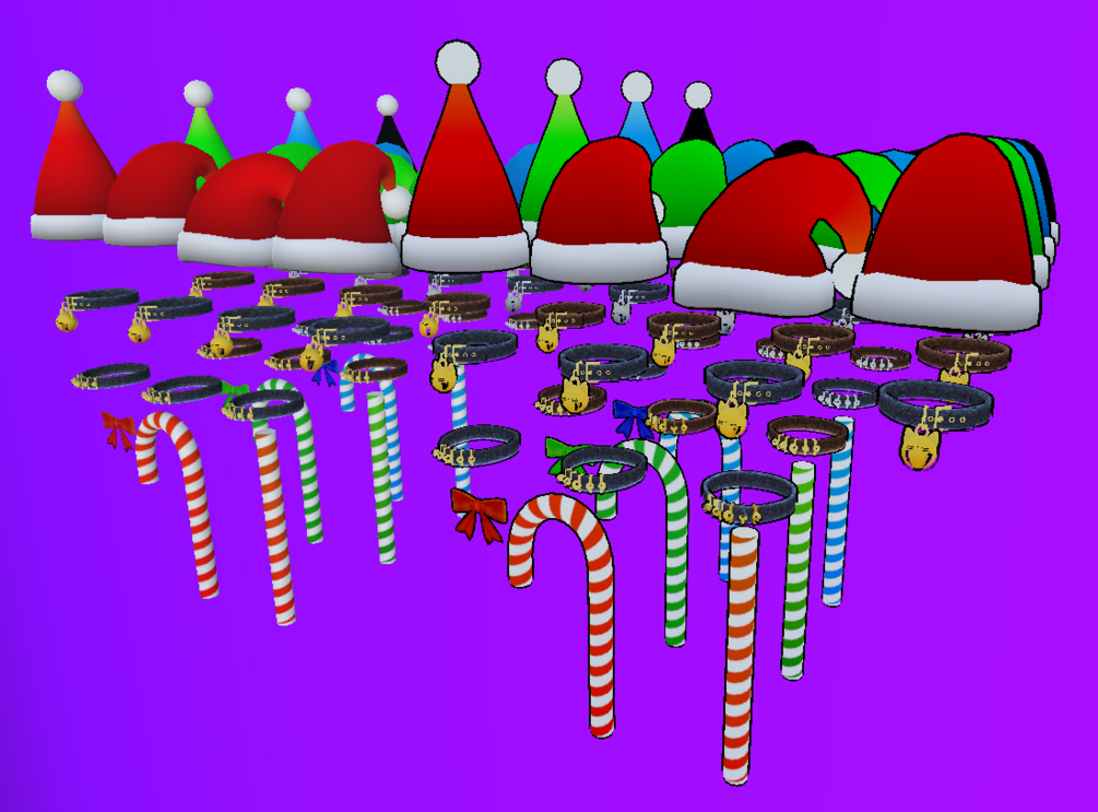 Christmas accessory pack for VRChat avatars and worlds! Includes a Christmas hat, a bow, two candy canes, and two collars.